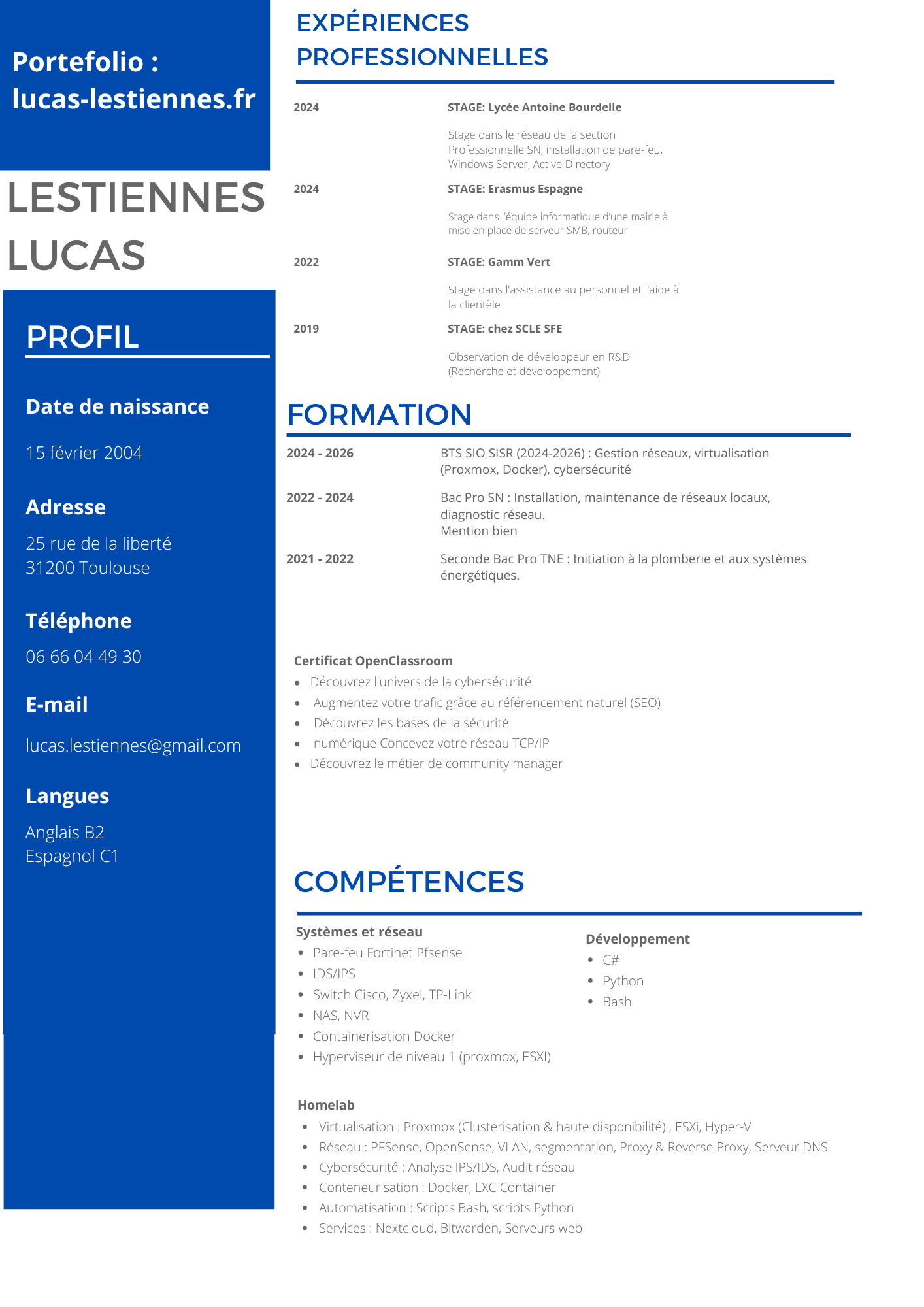 Je suis Lucas Lestiennes, étudiant en systèmes et réseaux, en cours de formation pour développer des compétences solides en virtualisation, infrastructure réseau et cybersécurité. Motivé et passionné, je suis à la recherche d'opportunités pour mettre en pratique mes connaissances et continuer à apprendre dans le domaine de l'informatique.